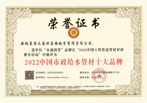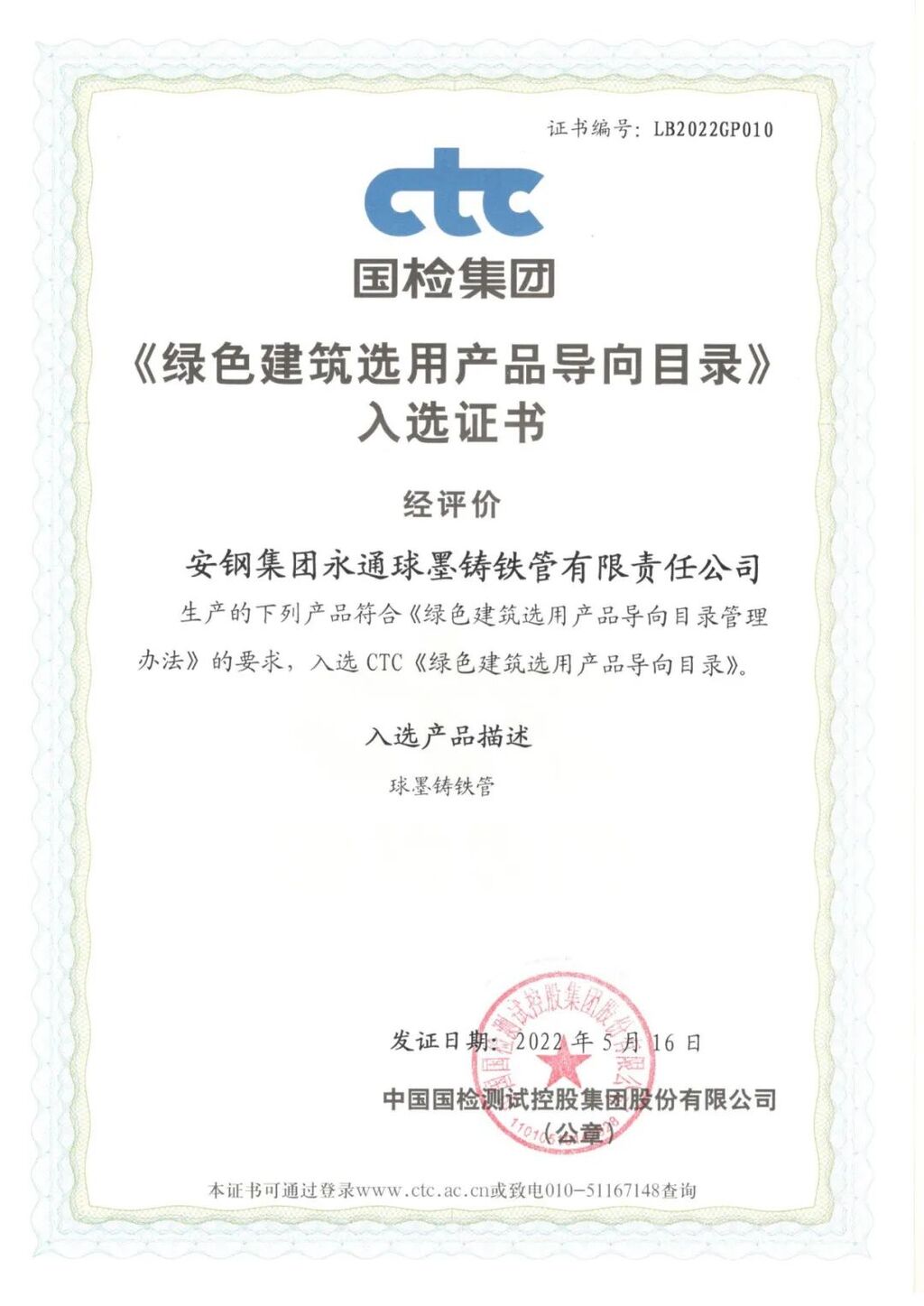 蝉联!安钢永通铸管产品再获“绿色建筑选用产品” 殊荣5月26日,安钢永通公司传来喜讯,经过国家建筑材料测试中心评价认定,永通公司生产的球墨铸铁管产品再次荣获国家建筑材料测试中心颁