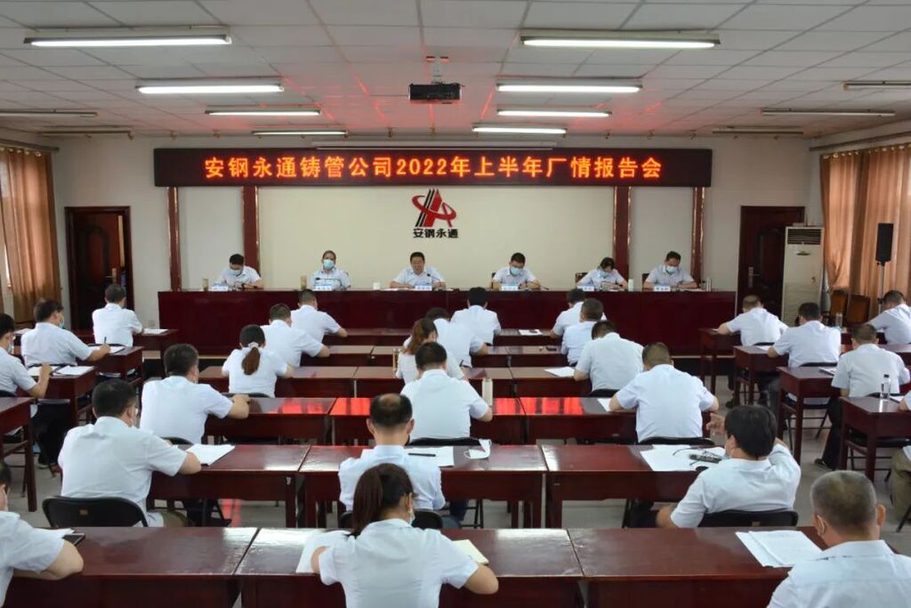 安钢永通铸管公司召开2022年上半年厂情报告会7月22日,永通公司召开2022年上半年厂情报告会。会议总结回顾上半年各项工作,深入分析当前面临形势,安排部署下半年重点任务,动员